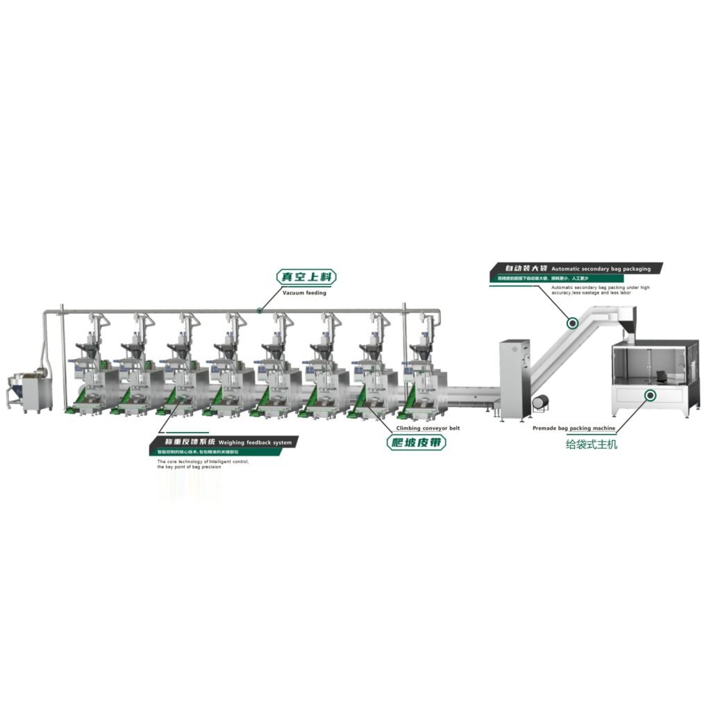 This is fully automatic packing line, one feeding port for N sets of vacuum feeder, supply up to 20 sets of sachet packingmachine. Connect simply, automatic control, it is the best combination of unmanned operation workshop and tourismworkshop. One intelligent counting line, 2-3 operators available, greatly save labor costs, Comparing 8 set of sachetpacking machine with counting line with manual bagging, we can help you save at least 10-15 operators, more than200,000 RiB labor costs can be saved a year. Excluding the input of the sachet packing machine, you will get theinvestment back within 1 year, improved efficiency, saved loss , all are real profits.